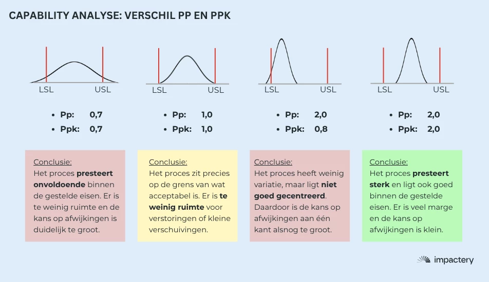 Dat is belangrijk, want veel organisaties starten al snel met oplossingen terwijl de echte prestatie nog niet scherp is. Ppk helpt om dat te voorkomen. Je ziet niet alleen of de spreiding te groot is, maar ook of het procesgemiddelde te dicht tegen een onder of bovengrens aan zit. Stel dat een productieproces op papier stabiel lijkt, maar de metingen structureel dicht tegen de bovengrens aan liggen. Dan lijkt er weinig aan de hand, terwijl het risico op afkeur in de praktijk groot is. Juist daarom is Ppk in de Measure fase zo waardevol. Het maakt zichtbaar wat de klant werkelijk ervaart en geeft richting aan de analyse in de volgende DMAIC stap.