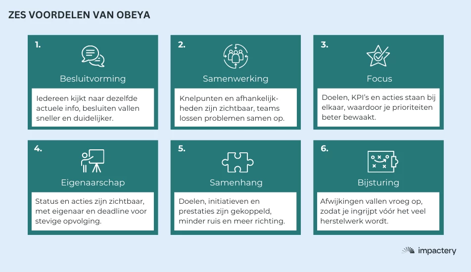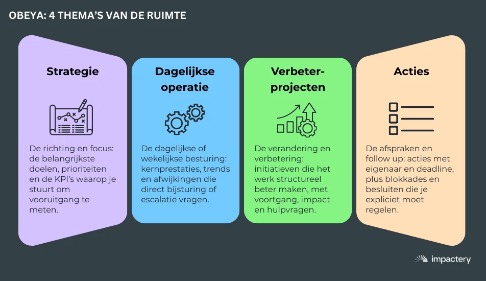 Je ziet in één oogopslag hoe je ervoor staat, welke KPI’s afwijken, welke verbeterinitiatieven lopen en wie wat oppakt. Dat maakt de Obeya sterk voor strategie-uitvoering en Lean dagelijks management, omdat het overleg niet draait om meningen maar om zichtbare feiten en opvolging. Een praktisch voorbeeld is een managementteam dat wekelijks in de Obeya langs vaste borden loopt met strategische doelen, lopende verbeterprojecten en operationele KPI’s, en afwijkingen direct vertaalt naar concrete acties met een eigenaar en een heldere deadline.